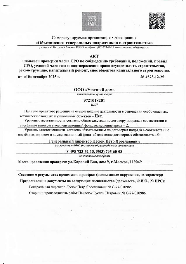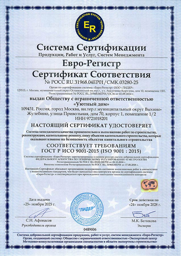 Строительная компания ООО "Уютный дом" обладает всеми необходимыми сертификатами и разрешительными документами для выполнения индивидуальных и государственных строительных заказов.